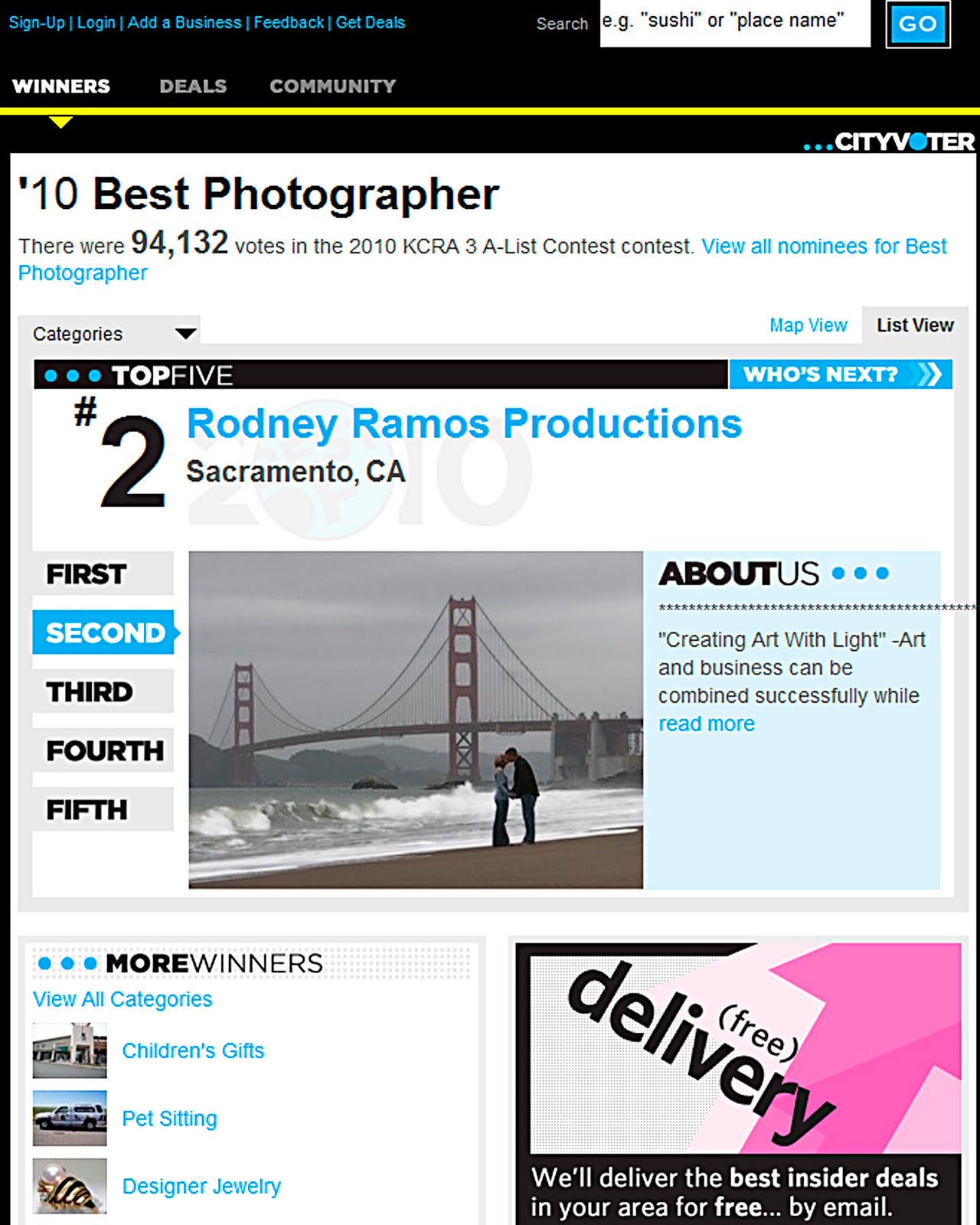Because of all of you Rodney Ramos Productions has made KCRA's A-List for the 4th straight year. There were over 190 Sacramento area photographers and Rodney Ramos Productions placed 2nd place. Congratulations to the 1st place photographer and the other 3 who made the A-List.